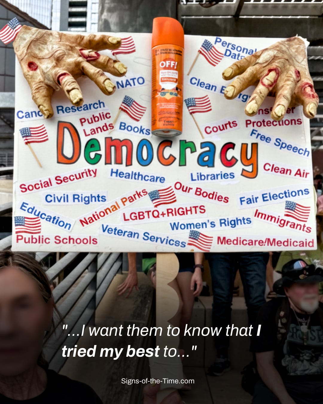 DONNA: I am kind of proud of the sign because I thought of using the scary hands and insect spray can to say “Hands Off” all of the things that are important to me. You can see all these different words and phrases with Democracy in the center and many of our rights and resources surrounded by American flags.